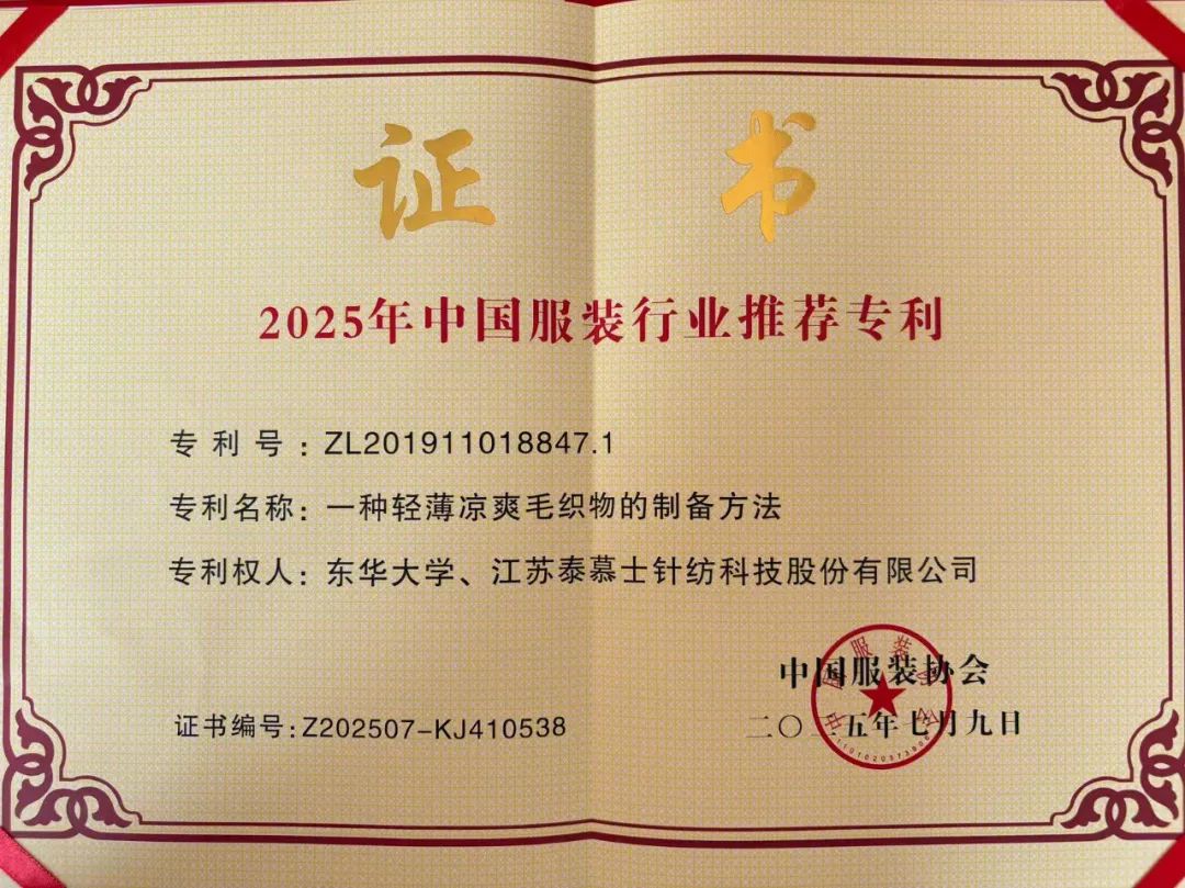 【概要描述】熱烈祝賀泰慕士與東華大學產學研深度合作的結晶——“一種輕薄涼爽毛織物的制備方法”發明專利,榮膺“2025年中國服裝行業推薦專利”!這不僅是一份閃耀的行業認可,更是對泰慕士深耕技術、矢志創新的最高禮贊。